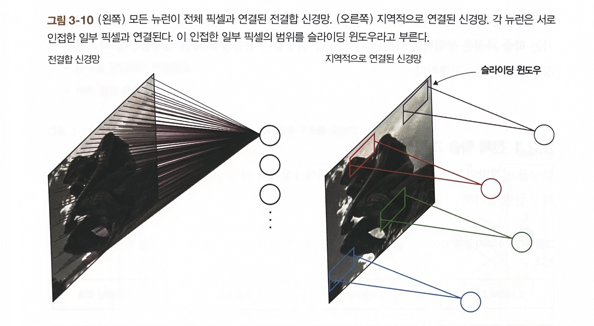 위 두 가지 단점을 개선한 것이 CNN 1번에서 CNN은 2차원 이미지를 그대로 입력할 수 있고, 멀리 떨어진 픽셀보다는 서로 가까운 픽셀끼리 관계가 깊다는 것을 이해할 수 있다. 2번에서 CNN은 지역적으로 연결된(locally connected) 구조의 층을 갖는다. 합성곱 신경망의 노드는 이전 층의 노드 중 일부하고만 연결된다. 지역적 연결을 가진 층은 전결합층에 비해 파라미터 수가 훨씬 적다. 각 뉴런은 서로 인접한 일부 픽셀과 연결되는데, 이 인접한 일부 픽셀의 범위를 슬라이딩 윈도우(sliding window)라고 부른다.