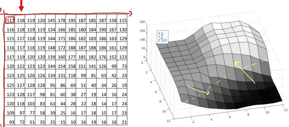 경계는 강도가 급격하게 변하는 부분이다. 이를 그래프로 나타내면, 위의 그래프처럼 나타낼 수 있는데, 좌표계의 원점은 좌측 상단이 되고, intensity value가 z축에 표시된다. intensity value가 낮아지는 부분이 경계가 되는 것이다.