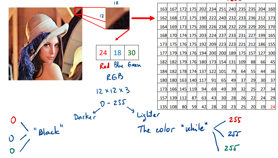 오른쪽의 12x12행렬에 포함된 값을 강도(intensity)값이라고 한다. intensity value는 하나당 1바이트, 8비트이다. 0~255의 값을 가지고, 0에 가까울수록 강도가 낮다. 0에 가까울 수록 어둡고 255에 가까울수록 밝아진다. 빨강, 초록, 파랑 모두 최대 intensity value값을 가질 때 이를 합하면 흰색이 된다.