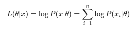 $$L(\theta|x) = \log P(x|\theta) = \sum_{i=1}^{n}\log\frac{1}{\sigma\sqrt{2\pi}}\exp\left(-\frac{(x_i-\mu)^2}{2\sigma^2}\right) $$