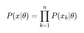 $$ P(x|\theta) = \prod_{i=1}^{n}f_{X_i}(x_i;\theta)= \prod_{i=1}^{n}\frac{1}{\sigma\sqrt{2\pi}} \exp \left( -\frac{(x_i-\mu)^2}{2\sigma^2} \right) $$