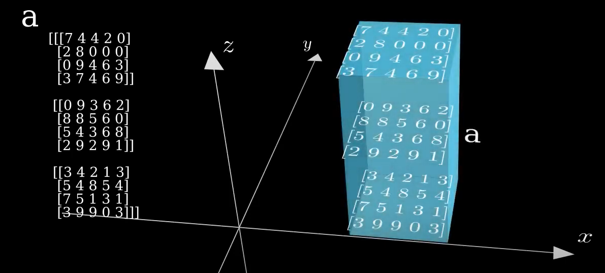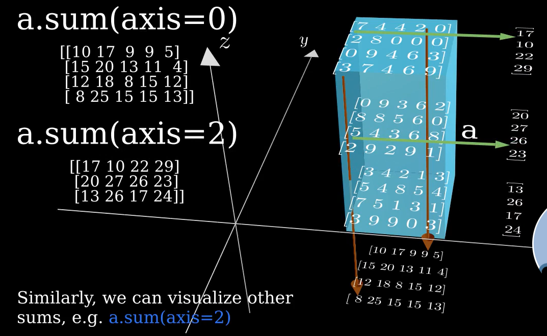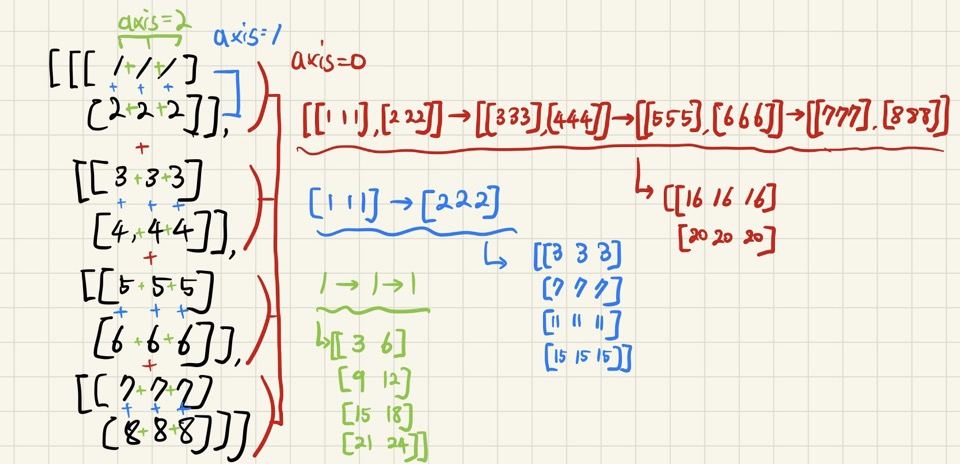 # 예시1) arr=np.array([[[1,2,3]], [[1,2,3]], [[1,2,3]], [[1,2,3]]]) print(np.sum(arr, axis=0)) print(np.sum(arr, axis=1)) print(np.sum(arr, axis=2)) print(np.sum(arr, axis=2, keepdims=True)) ---------------------------------- # axis=0, z축 [[ 4 8 12]] # axis=1, y축 [[1 2 3] [1 2 3] [1 2 3] [1 2 3]] # axis=2, x축 [[6] [6] [6] [6]] # axis=2, x축, keepdims=True [[[6]] [[6]] [[6]] [[6]]]# 예시2) arr1=np.array([[[1,1,1], [2,2,2]], [[3,3,3], [4,4,4]], [[5,5,5], [6,6,6]], [[7,7,7], [8,8,8]]]) print(np.sum(arr, axis=0)) print(np.sum(arr, axis=1)) print(np.sum(arr, axis=2)) print(np.sum(arr, axis=2, keepdims=True)) print(np.linalg.matrix_rank(arr)) ------------------------------------------- # axis=0, z축 [[16 16 16] [20 20 20]] # axis=1, y축 [[ 3 3 3] [ 7 7 7] [11 11 11] [15 15 15]] # axis=2, x축 [[ 3 6] [ 9 12] [15 18] [21 24]] # axis=2, x축, keepdims=True [[[ 3] [ 6]] [[ 9] [12]] [[15] [18]] [[21] [24]]]* axis=0