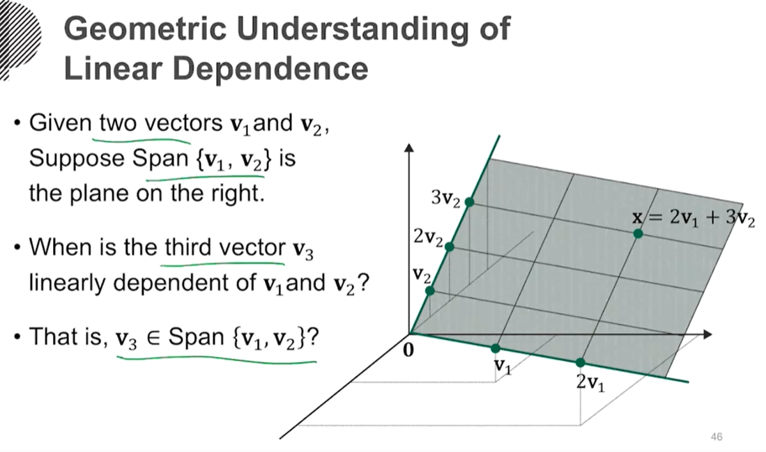 전체 dimension이 5차원이고, 3개의 기저 벡터의 unique집합을 S라고 하고, 집합 S에 속하는 기저 벡터들로 구성되는 3차원 부분 공간을 W라고 했을 때, S는 부분 공간 W를 span한다고 말하고, W=span(S)라고 표현한다.