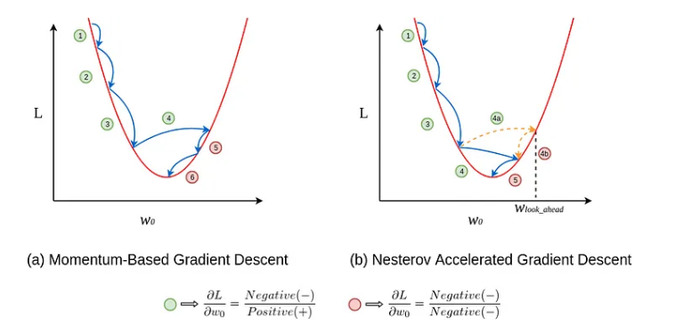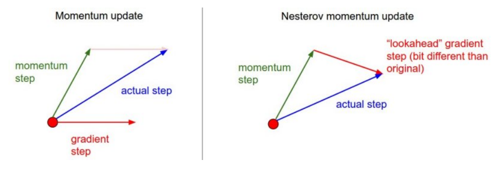 - momentum optimizer가 관성의 효과로 최적값을 지나칠 수 있는 문제를 개선한 것이 NAG( 지그재그를 줄이고 더 빠르게 수렴할 수 있다.)