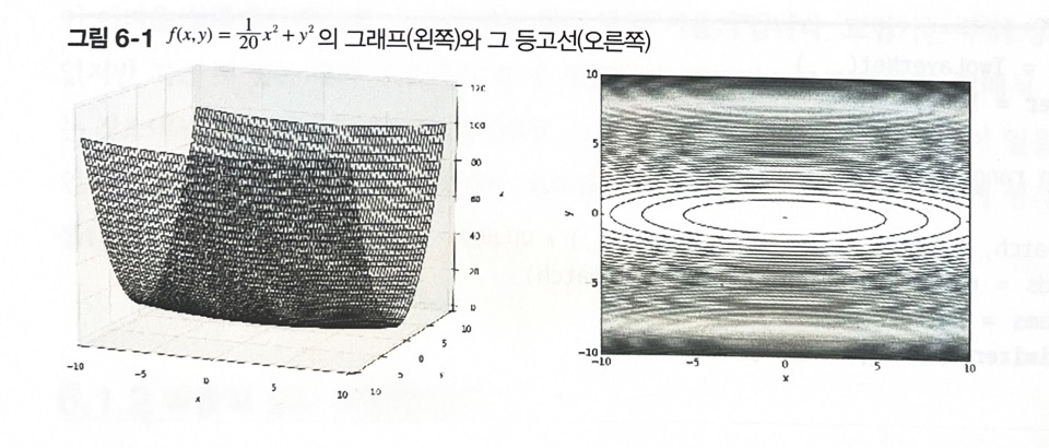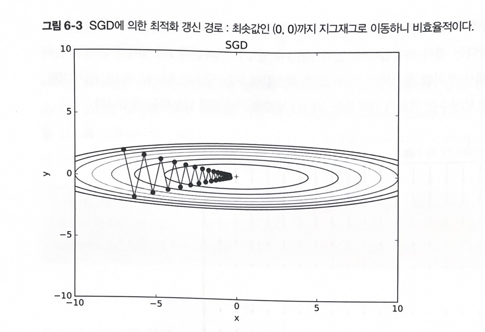 - SGD의 단점은 비등방성(anisotropy 함수; 방향에 따라 성질, 즉 여기에서는 기울기가 달라지는 함수)에서는 탐색 경로가 비효율적이라는 점이다.