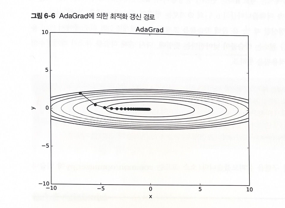 - AdaGrad는 과거의 기울기를 제곱하여 계속 더해간다. 그래서 학습을 진행할수록 갱신 강도가 약해진다. 실제로 무한히 학습하다보면 어느 순간 갱신량이 0이 되어 전혀 갱신되지 않게 되는 문제가 있다.
