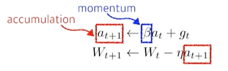 - a는 accumulation 혹은 v (velocity)로도 쓰는데, 기울기 방향으로 힘을 받아 물체가 가속된다는 물리 법칙을 나타낸다. beta는 0.9 등의 값으로 설정한다.