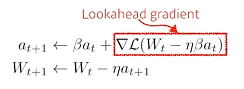 - Gradient(를 에서 계산하는 것이 아니라 관성(momentum)에 의해서 이동한 에서 계산한다.