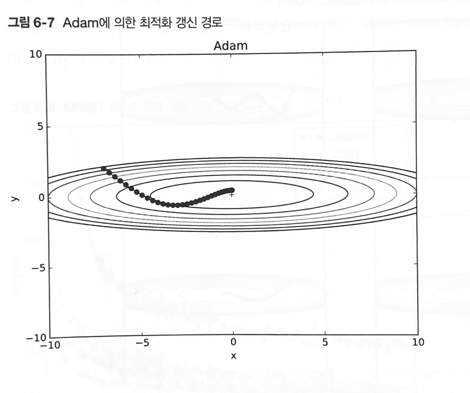 - y 축 방향은 기울기가 커서 처음에는 크게 움직이지만, 그 큰 움직임에 비례해 갱신 정도도 큰 폭으로 작아지도록 조정된다. 그래서 y축 방향으로 갱신 강도가 빠르게 약해지고, 지그재그 움직임이 줄어든다.
