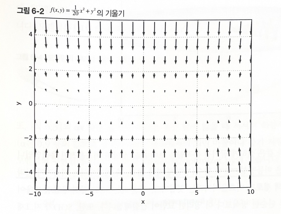 - 또한, 최솟값이 되는 장소는 (x, y) = (0,0) 그림의 gradient를 보면 대부분이 (0,0) 방향을 가리키지 않는다.