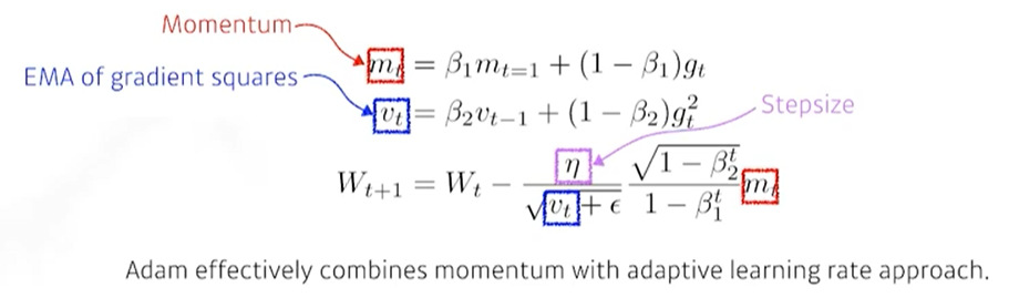 - 과거의 모든 기울기를 균일하게 더해가는 것이 아니라, 먼 과거의 기울기는 서서히 잊고 새로운 기울기 정보를 크게 반영한다. 이를 지수이동평균(Exponential Moving Average, EMA)이라 하며, 과거 기울기의 반영 규모를 기하급수적으로 감소시킨다.