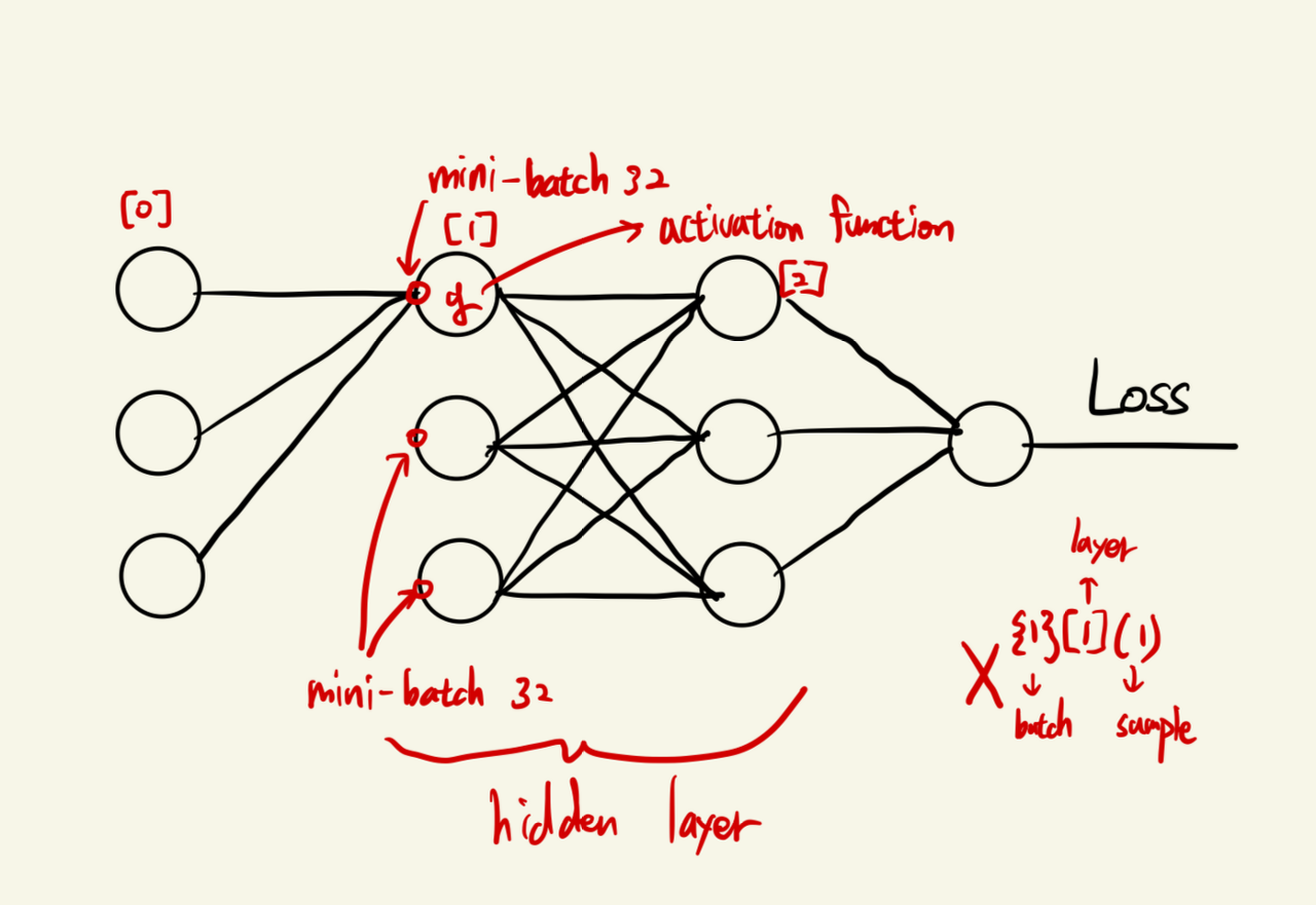 - 총 데이터 수가 3200개이고, batch size =32이면, 하나의 배치에 32개의 샘플이 있고 100개의 mini batch로 나뉜다.→mini-batch size = 32는 표본크기(sample size)= 32로 임의 추출한 상황과 같다.