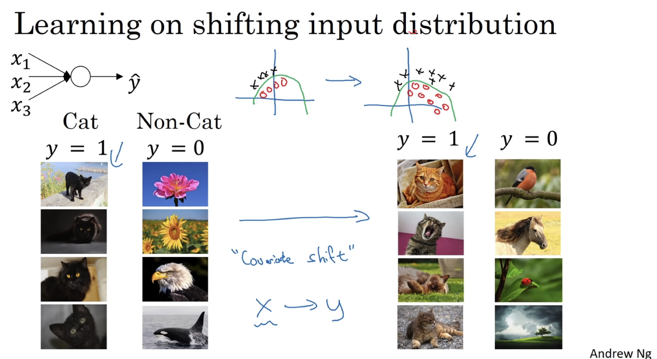 예를 들면, 흰색 고양이로 치워친 훈련 데이터로 학습된 고양이 분류기에 흰색이 아닌 다른 색 고양이 이미지를 분류할 때 좋은 성능이 나오지 않는 경우로, 이러한 입력데이터 분포의 변화를 공변량 시프트라고 한다.