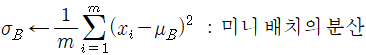m이 배치 내 데이터 수일 때 미니배치의 평균(mu_B)과 표준편차(sigma_B)는 다음과 같이 계산한다.