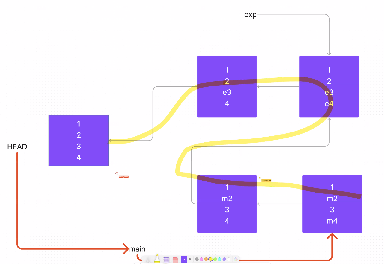 만약 main을 그대로 둔 채로 commit하면 main이 움직이게 되므로 실험적인 가지의 의미가 퇴색된다.