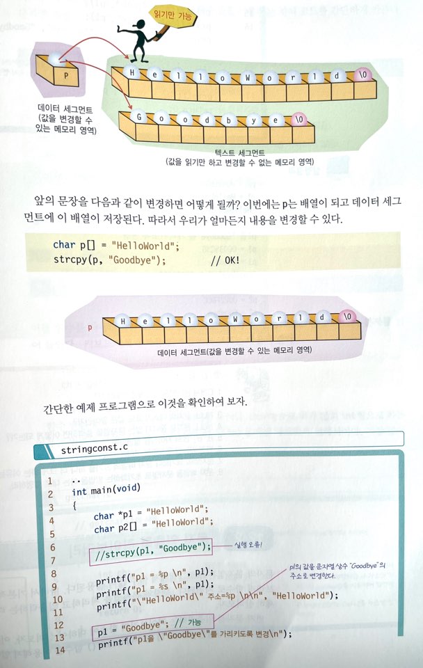 문자열 상수는 프로그램이 사용하는 메모리 영역 중에서 텍스트 세그먼트(text segment)라고 불리는 특수한 메모리 영역에 저장된다. 텍스트 세그먼트는 읽기는 가능하지만, 우리가 변경 할 수 없는 메모리 영역이다.