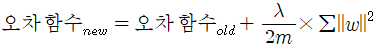 - 가중치 수정시 아래 편미분값을 빼는데, 오차함수의 함숫값이 기존보다 커졌으므로 편미분값도 커지고 따라서 W_new는 규제항이 없을 때보다 작아진다.
