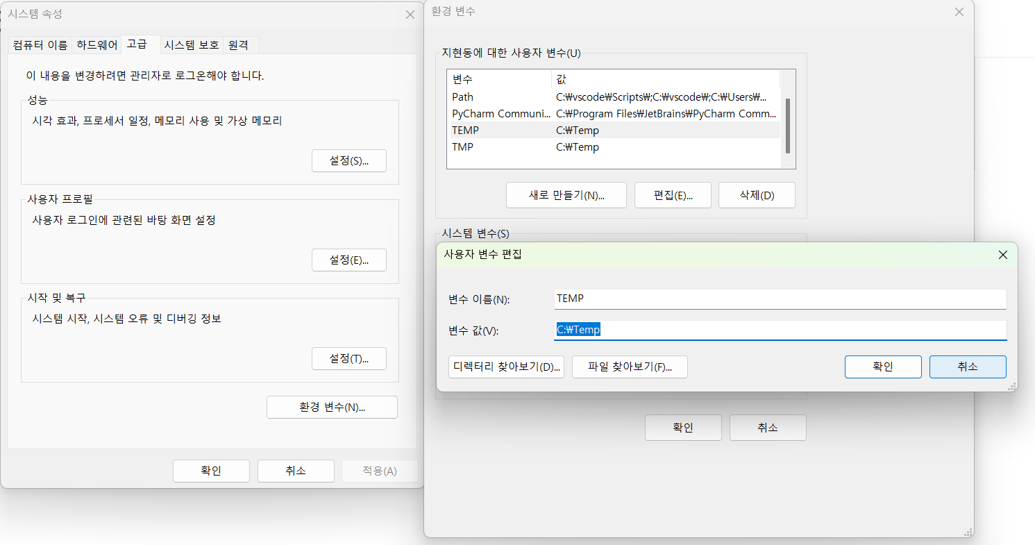 TEMP와 TMP의 환경 변수를 사진과 같이 C드라이브 밑에 있는 Temp 폴더로 변경해주었다.