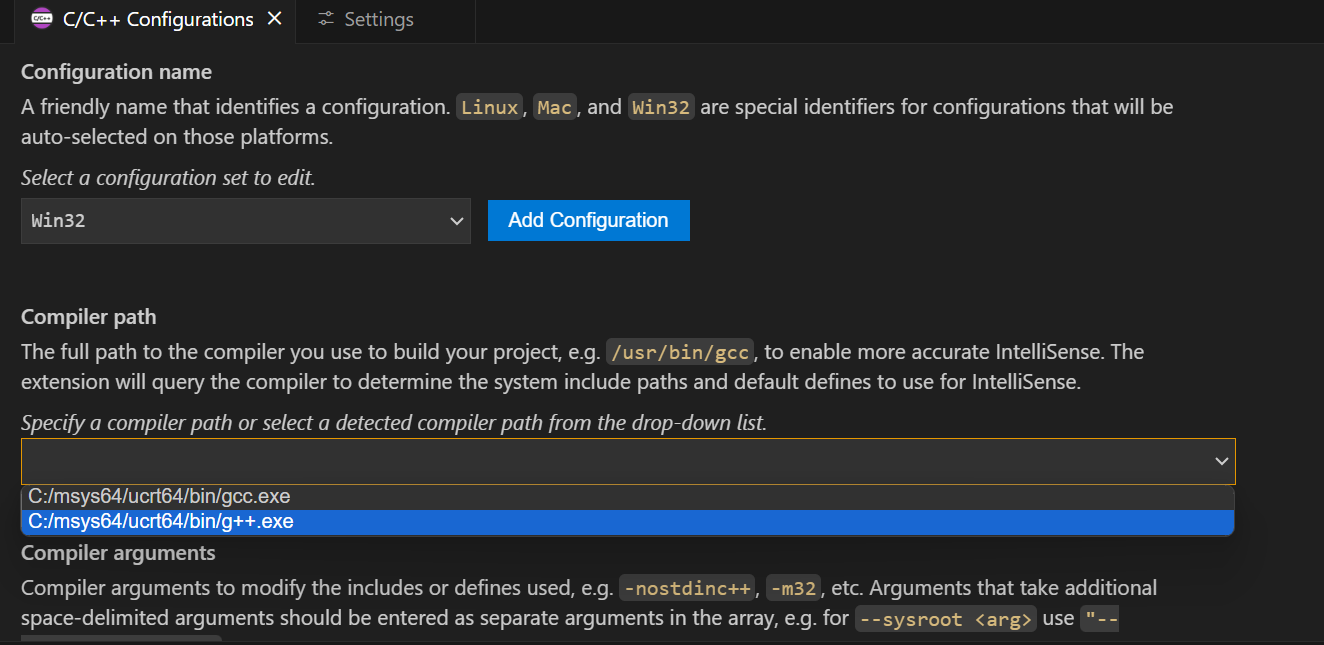 커맨드 팔렛트(ctrl+p)에서 >c++ edit configuration (UI) 에 들어가서 컴파일러 경로를 g++로 지정해주자.