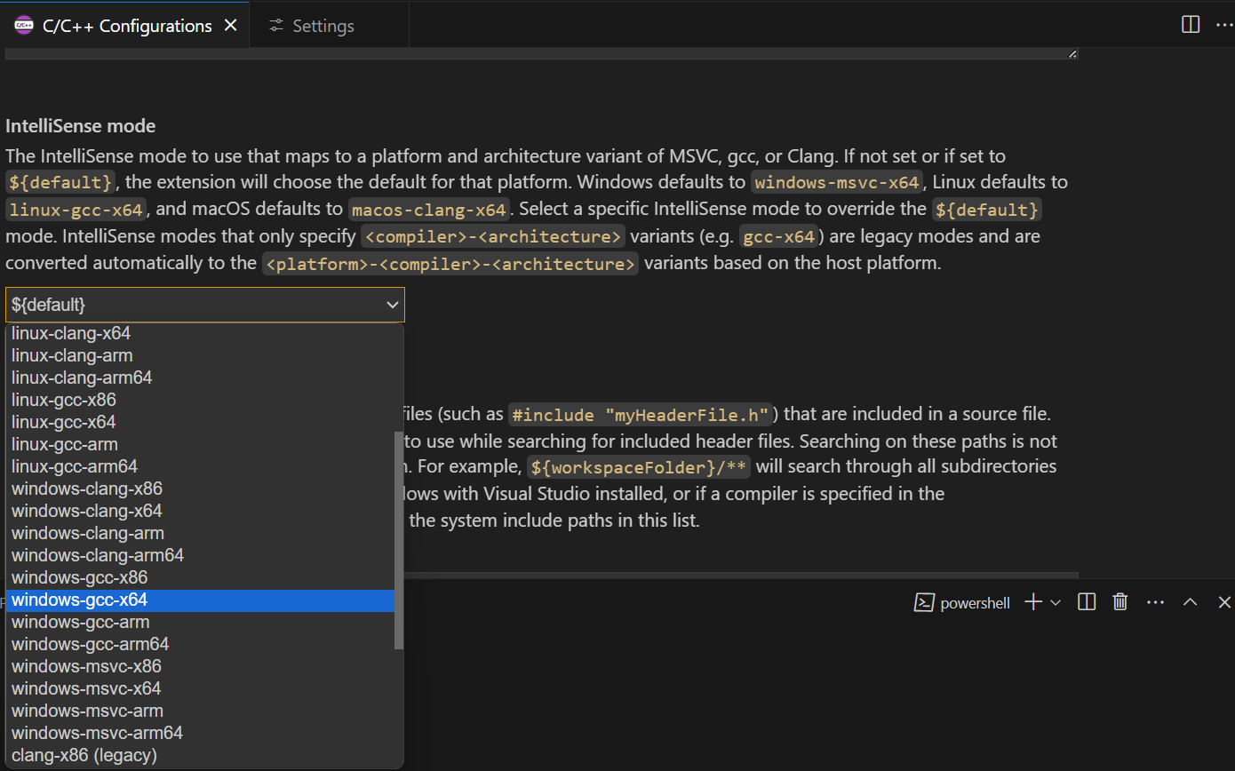 스크롤 내려서 아래와 같이 IntelliSense mode를 window-gcc-x64로 바꿔준다.