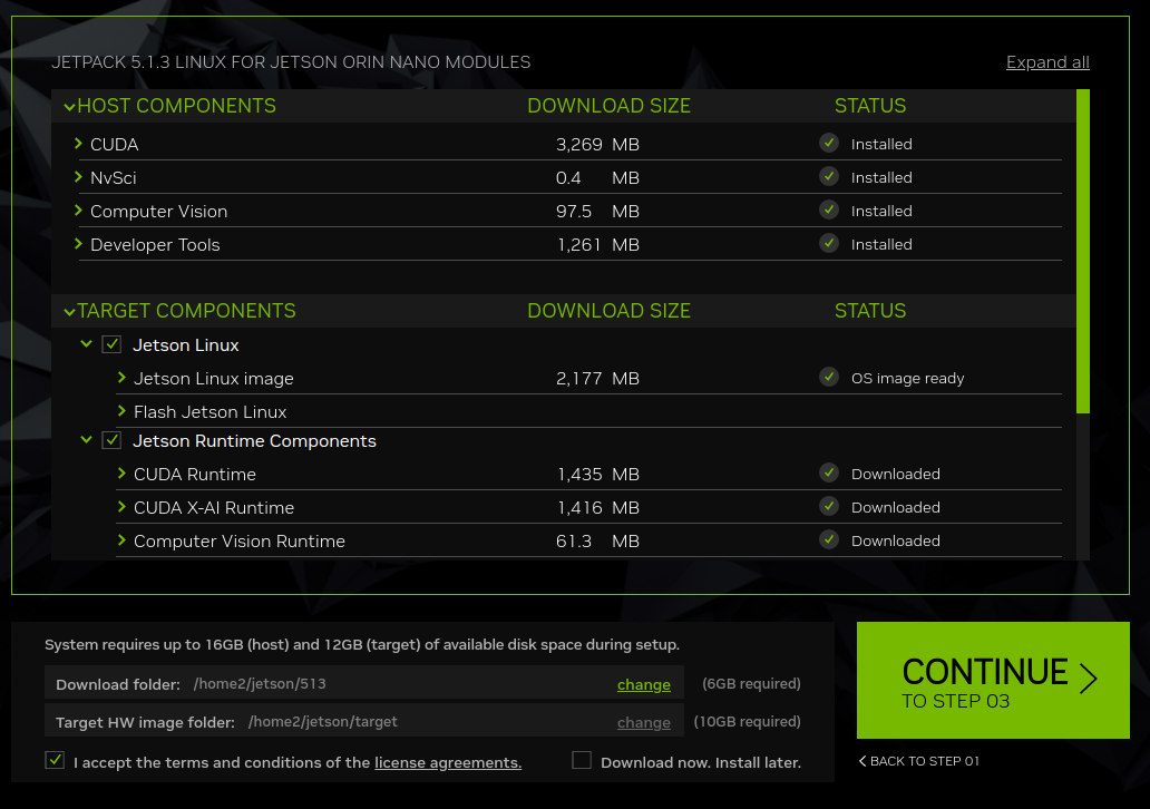 CONTINUE TO STEP 03을 눌러 설치를 진행하면 먼저 host pc에 jetpack 5의 설치 파일들이 설치되고, jetson orin nano로 옮겨간다.