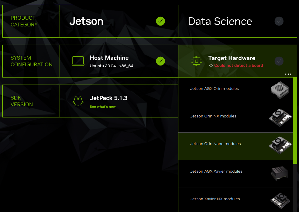 C type usb 케이블로 jetson orin nano를 host pc에 연결해준다. 제대로 인식된다면 Target Hardware 항목에서 Could not detect a board라는 빨간색 문구가 초록색으로 바뀐다.