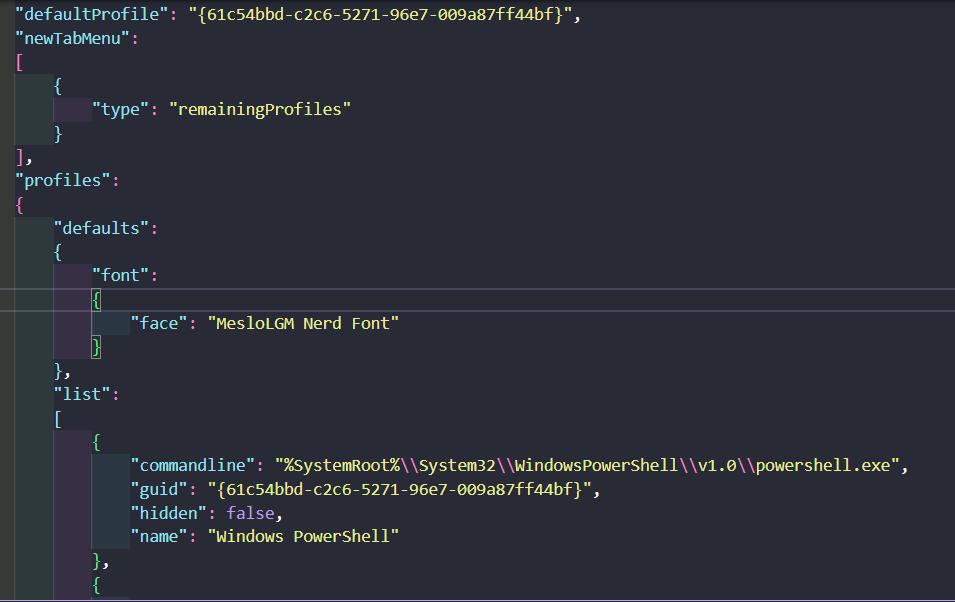 아래와 같이 font에서 MesloLGM Nerd Font를 입력해주었다.