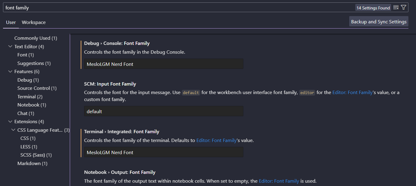 Debug > Console: Font Family와 Terminal > Integrated: Font Family가 보인다. 각각에 아래 사진처럼