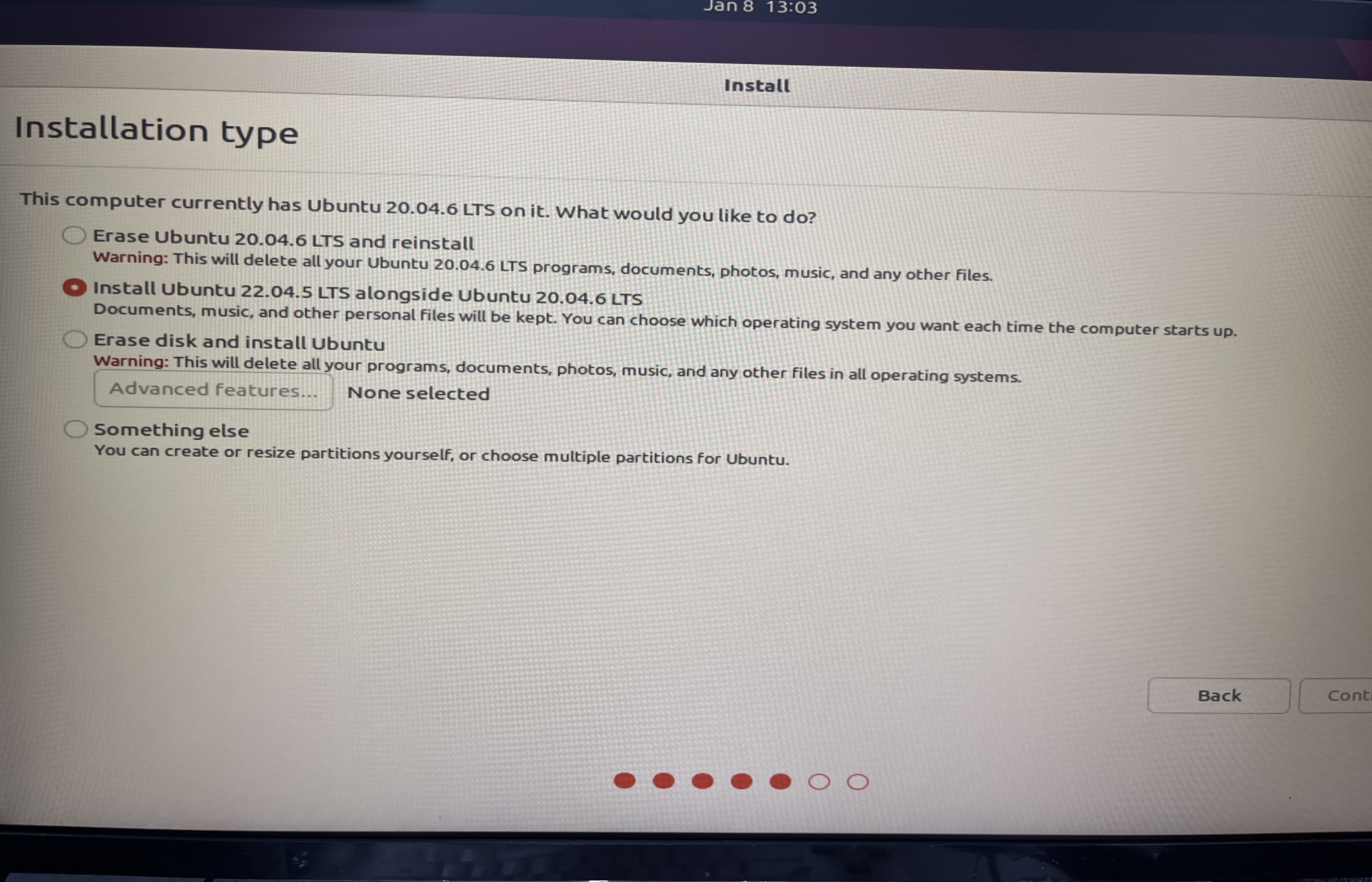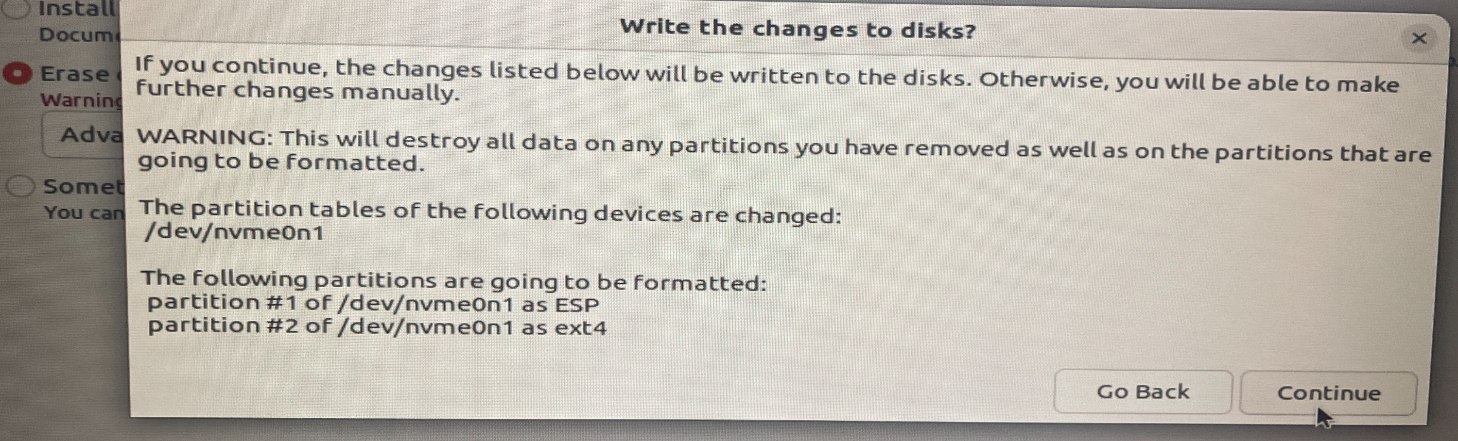 20.04에서 22.04로 버전을 바꿀 것이므로 disk를 모두 삭제하고 새로 설치하는 3번째 Erase disk and install Ubuntu를 선택했다.