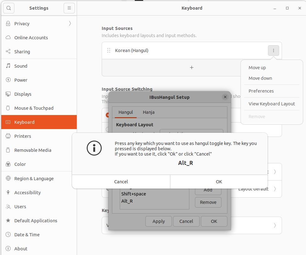 Korean(Hangul) 옆에 있는 점 세 개를 눌러서 Preferences - Hangul Toggle Key 옆에 있는 Add 누른다.