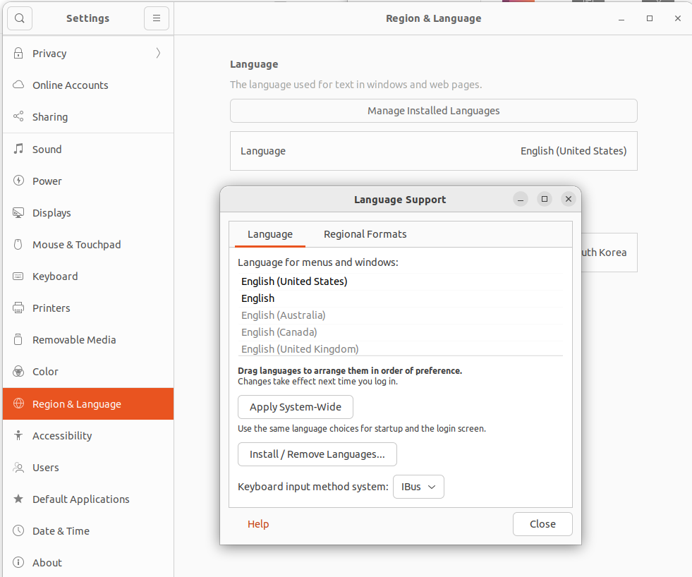 Settings - Region & Language - Manage Installed Languages에 들어가면 언어팩을 설치할 것이냐고 팝업창이 뜬다. install을 눌러 설치해준 후 컴퓨터를 재부팅해준다. korean(Hangul)이 설치된다.
