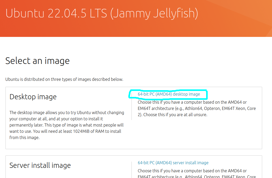 설치하고자하는 ubuntu버전의 iso파일을 다운받는다. 22.04LTS 버전을 다운받았다.