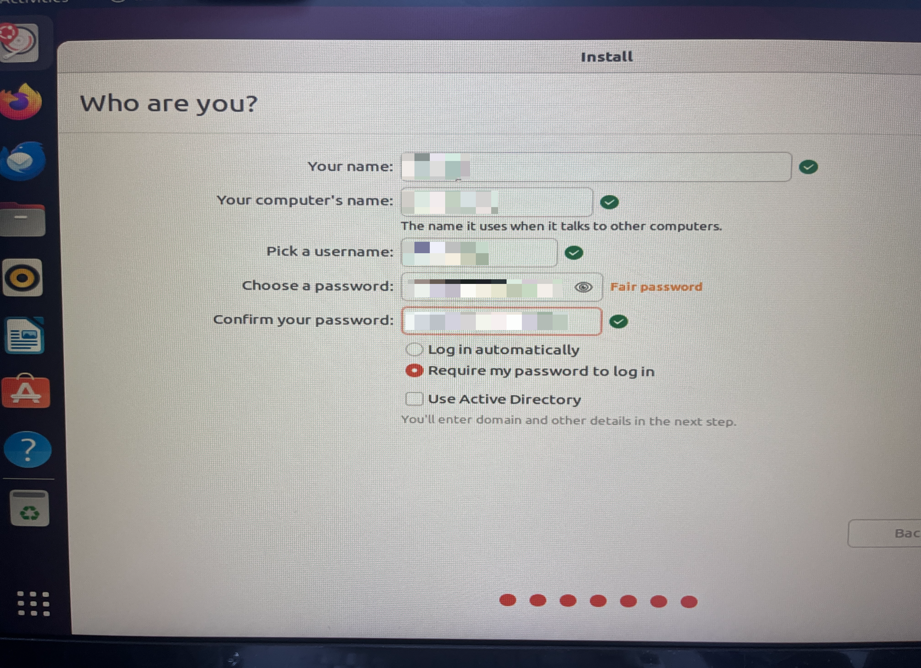 터미널을 실행하면 username@computer's name 형식으로 뜬다. 그 이름을 여기서 설정한다. 정보를 넣어주고 continue.