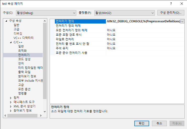 - #ifedf의 조건으로 사용되는 매크로는 소스 파일의 시작 부분에서 정의하기도 하지만 보통은 대부분의 컴파일러에서 소스를 건드리지 않고 컴파일러의 대화 상자에서 변경할 수 있도록 한다. Visual Studio에서도 "프로젝트 -> test의 속성" 메뉴를 클릭하면 아래 대화 상자가 나오고 여기에서 프로그래머가 원하는 매크로를 정의할 수 있다.
