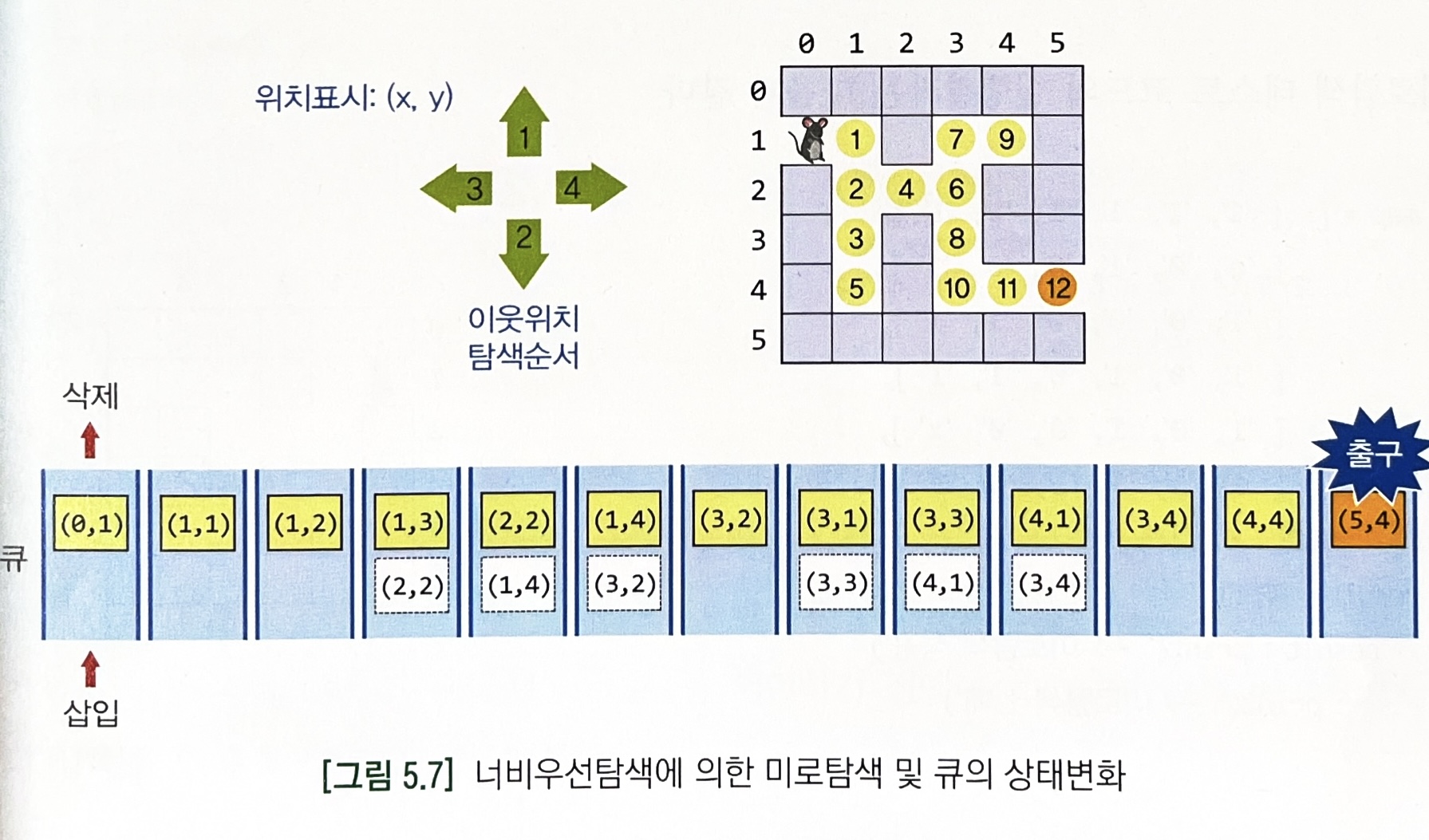 출처 : 파이썬으로 쉽게 풀어쓴 자료구조 # from CircularQueue import* def isValidPos(x, y): if x < 0 or y < 0 or x >= MAZE_SIZE or y >= MAZE_SIZE: return False else: return map[y][x] == "0" or map[y][x] == "x" def BFS(): que = CircularQueue() que.enqueue((0, 1)) print("BFS: ") while not que.isEmpty(): here = que.dequeue() print(here, end="->") x, y = here if map[y][x] == "x": return True else: # 탐색 순서가 '상하좌우'이기에 위 사진에서의 순서로 미로를 탐색한다. map[y][x] = "." # 지나간 자리 점으로 표시 if isValidPos(x, y - 1): # 상 que.enqueue((x, y - 1)) if isValidPos(x, y + 1): # 하 que.enqueue((x, y + 1)) if isValidPos(x - 1, y): # 좌 que.enqueue((x - 1, y)) if isValidPos(x + 1, y): # 우 que.enqueue((x + 1, y)) return False미로 예제