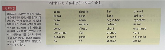 *키워드(keyword), 예약어(reserved words) : c언어에서 고유한 의미를 갖는 특별한 단어