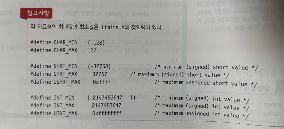 * 정수형의 한계를 알려주는 헤더 파일 limits.h -> #include <limits.h>