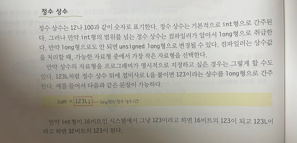 자료형 설명 바이트 수 범위 정수형 부호 있음 short short형 정수 2 -32768 ~ 32767 int 정수 4 -2147483648 ~ 2147483647 long long형 정수 4 -2147483648 ~ 2147483647 부호 없음 unsigned short 부호 없는 short형 정수 2 0 ~ 65535 unsingend int 부호 없는 정수 4 0 ~ 4294967295 unsingend long 부호 없는 long형 정수 4 0 ~ 4294967295 unsigned는 음수가 아닌 값만을 나타낸다는 것을 의미한다. signed는 반대로 음수도 가능하다는 것을 의미한다. (1byte = 8bit)