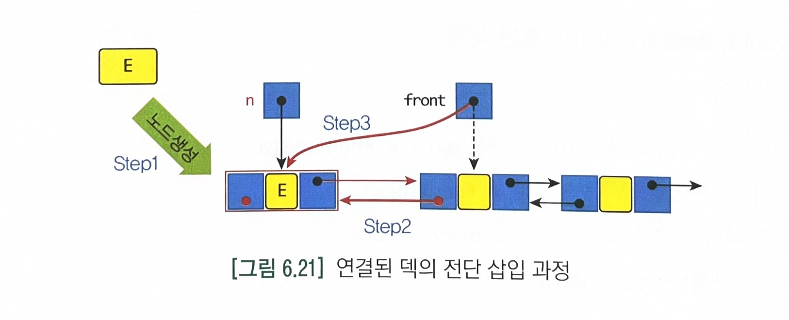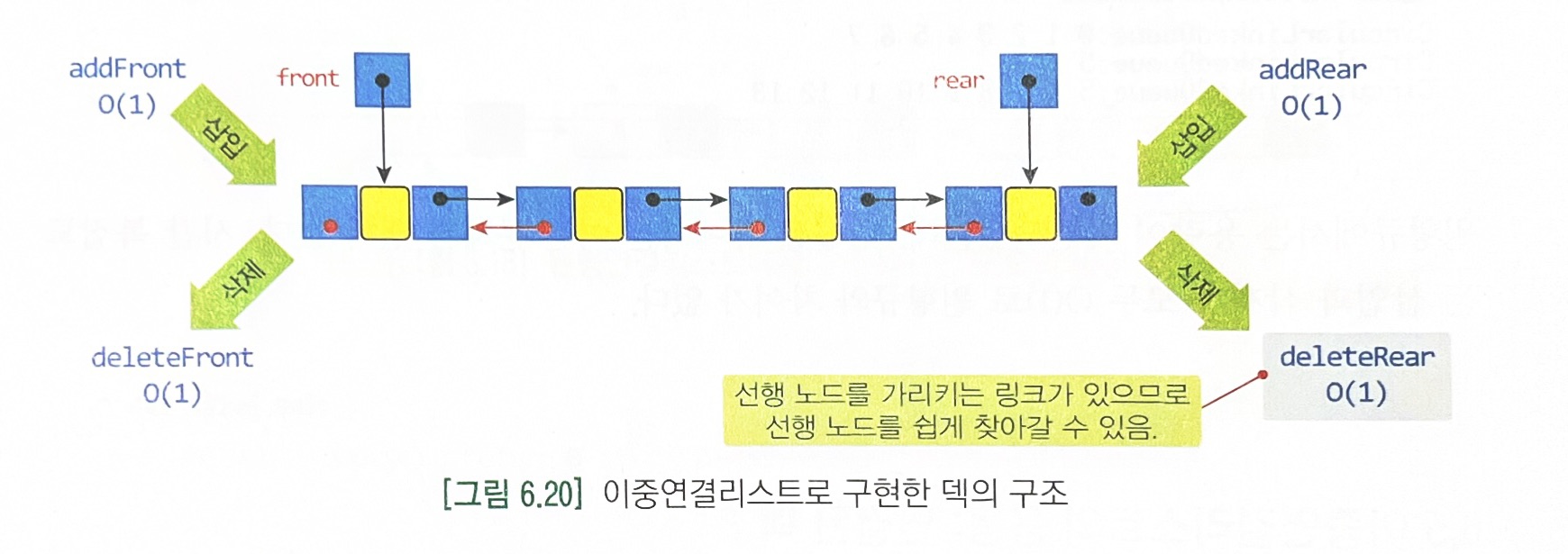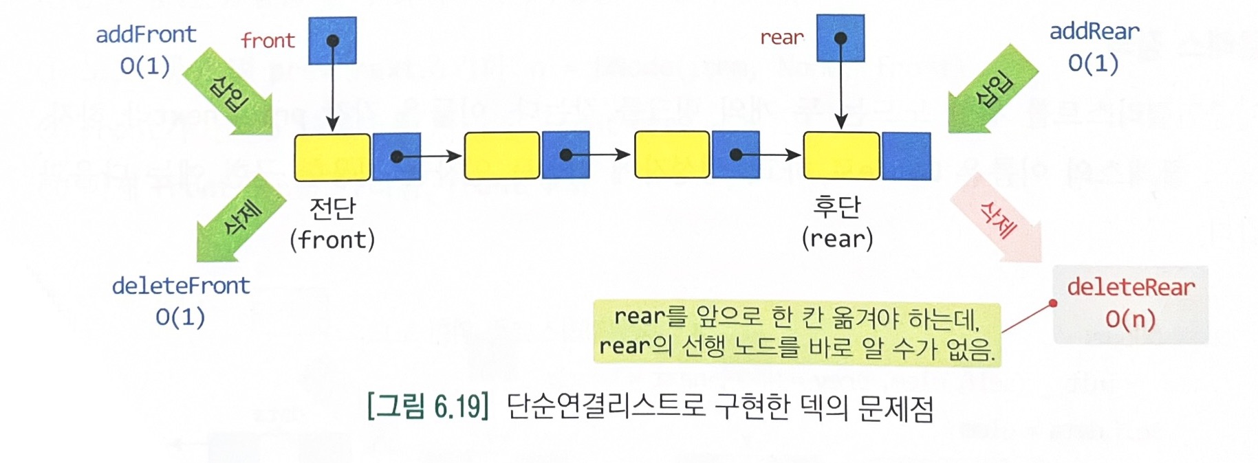 - 그러나 deleteRear연산에서 문제가 생긴다. 다른 연산들은 모두 O(1)에 처리가 가능한데 비해 이 연산은 O(n)이 걸린다. 후단을 삭제하고 나면 rear가 한 칸 앞으로 움직여야 하는데, 선행 노드의 정보가 없어서 front부터 탐색해야 하기 때문이다.