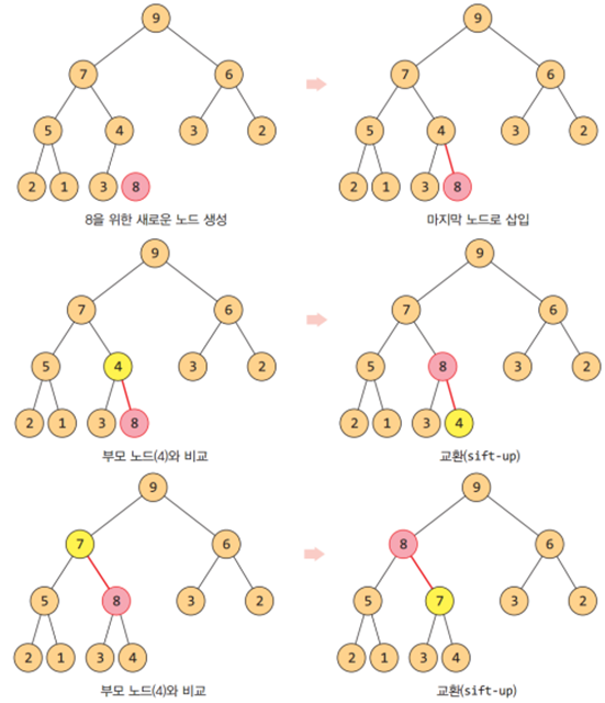 - 마지막 노드로 삽입된 새 항목은 루트 노드까지의 경로에 따라 적절한 위치를 찾을 때까지 부모노드와 교환하면서 위로 올라간다.