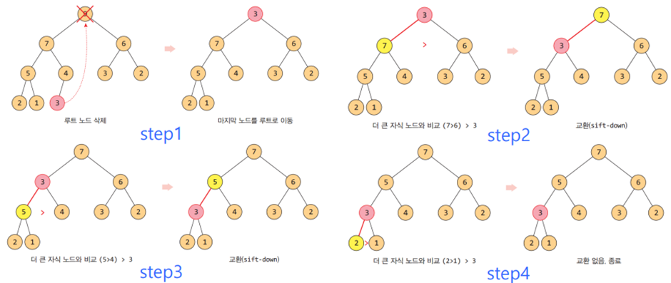 - 루트 노드를 자식과 비교하여 자식이 더 크면 교환한다. 이때, 자식들 중에서 더 큰 자식이 교환 후보가 된다. 이 과정을 자식이 없거나 자식이 더 작을 때까지 반복한다.