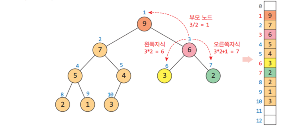 - 오른쪽 자식의 인덱스 = (부모의 인덱스)*2 + 1