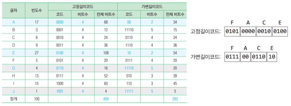 - 데이터를 압축할 때는 아스키 코드와 같은 고정길이 코드를 사용하지 않고 가변길이 코드를 흔히 사용한다.