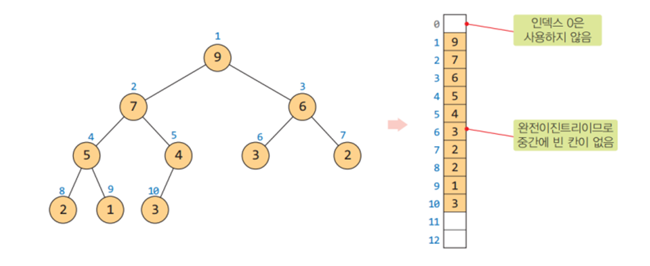 - 힙을 저장하는 효과적인 자료구조는 배열이다.