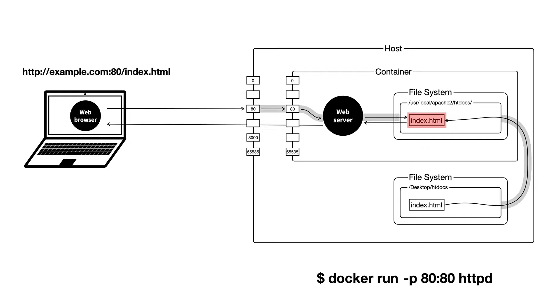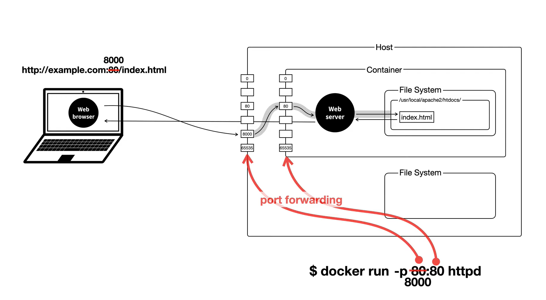 컨테이너와 host는 각자 독립된 환경이기때문에 각자의 포트와 파일시스템을 갖고 있다.