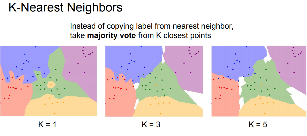 https://www.javatpoint.com/k-nearest-neighbor-algorithm-for-machine-learningwhat is the deal with these white regions? The white regions are where there was no majority among the k-nearest neighbors. for this simple example we're just coloring it white to indicate there was no nearest neighbor in those points.