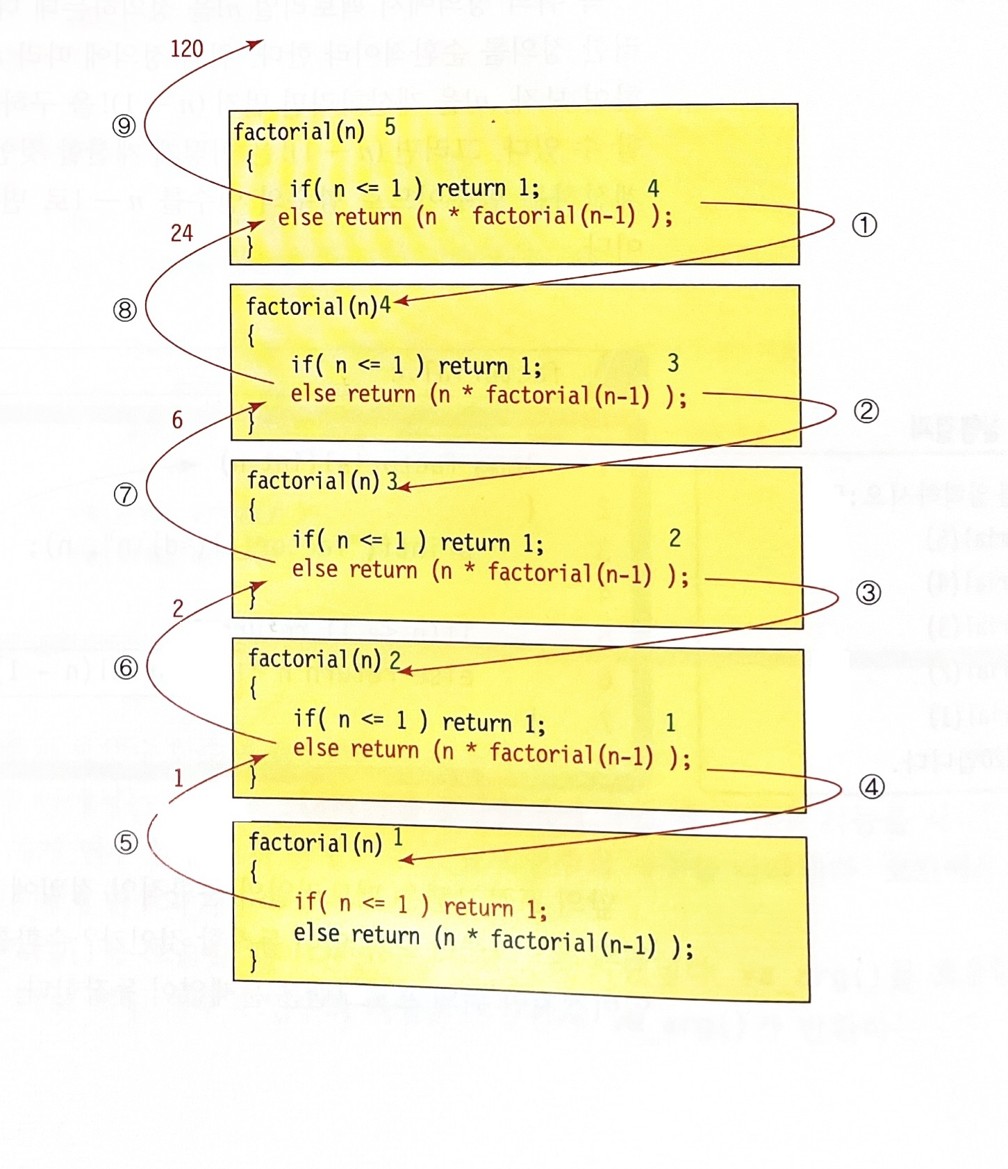 팩토리얼 함수의 순환 호출의 순서는 다음과 같다.