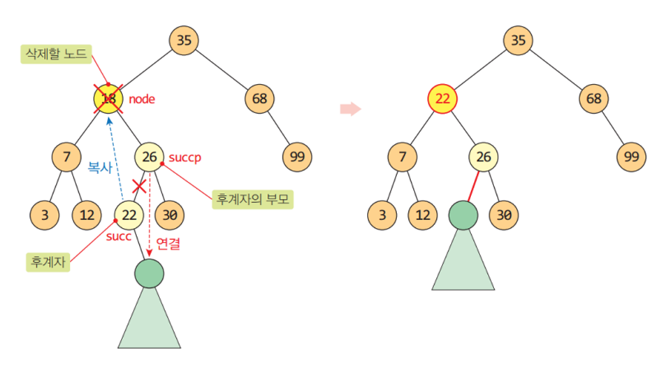 succp.right = succ.right # 후계자의 오른쪽 자식을 후계자의 부모에 연결