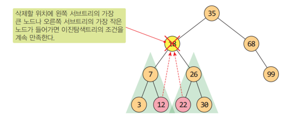 - 후계자로서, 왼쪽 서브트리의 가장 큰 값(12)이나 오른쪽 서브트리의 가장 작은 값(22)을 가진 노드가 적절하다.